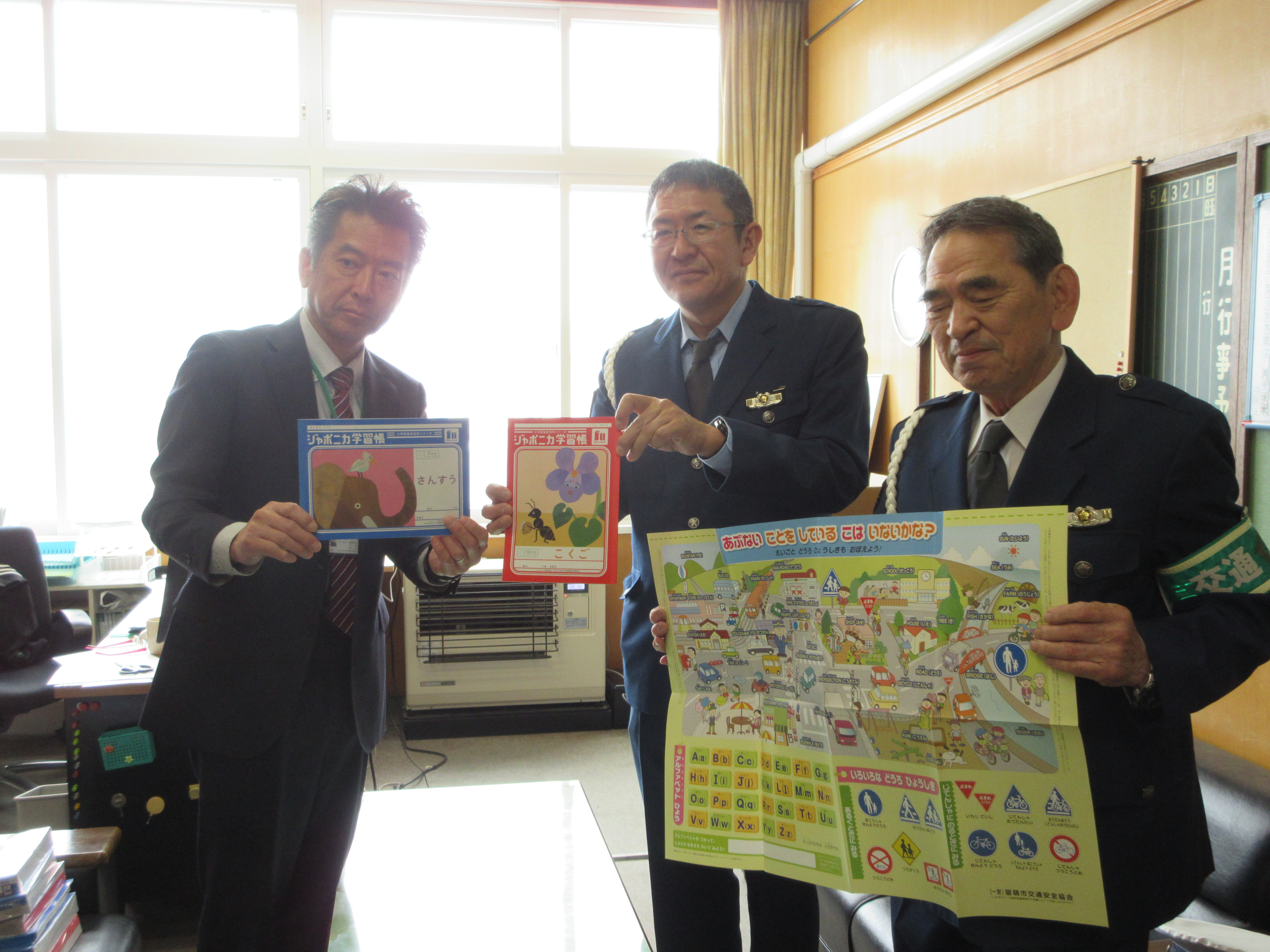 今年度も各小学校の新一年生へ交通ルールが学べるアルファベット表と学習ノートを贈りました。
