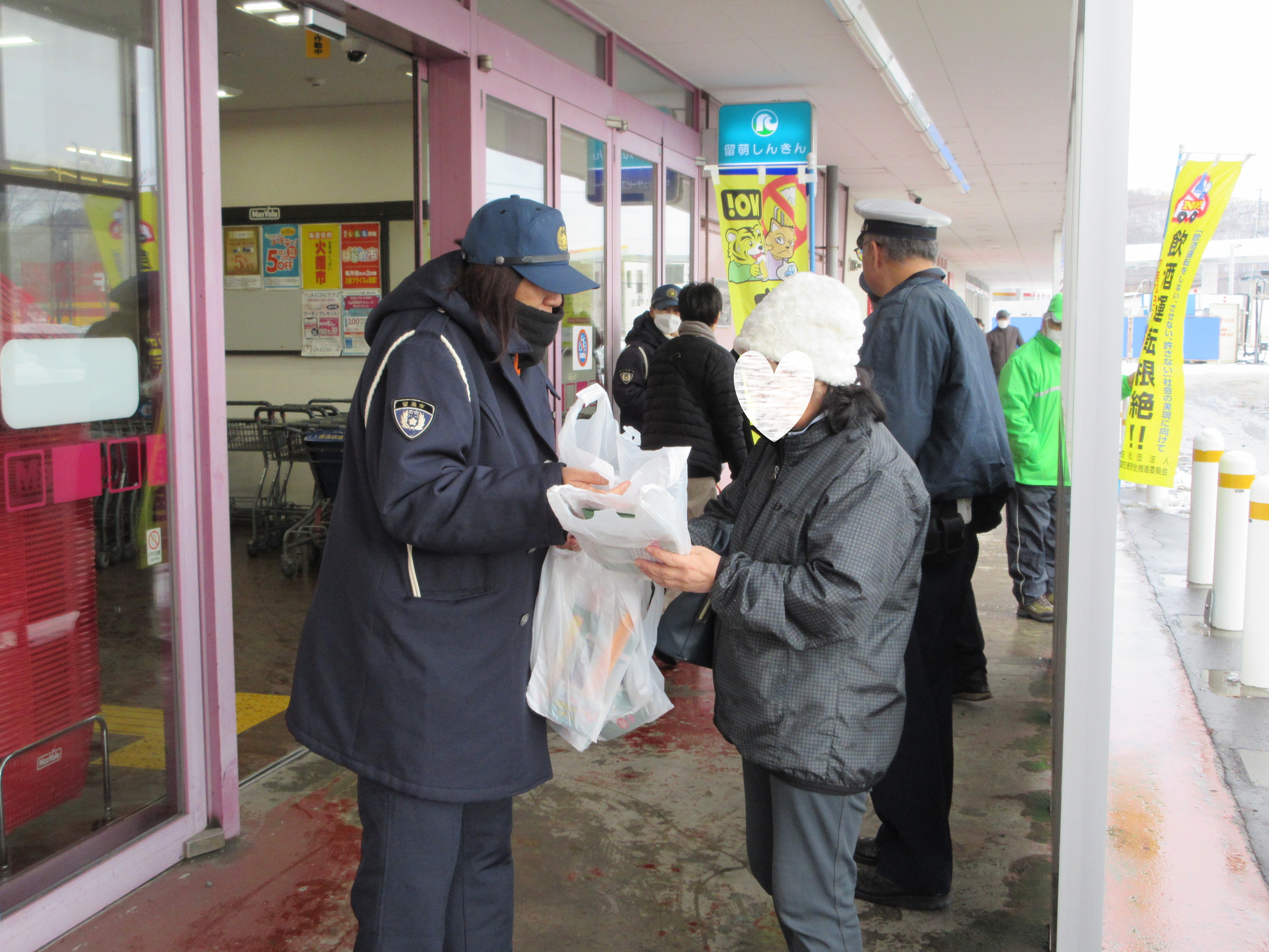 市内のスーパー出入口において、啓発グッズを手渡して飲酒運転根絶と交通事故防止を呼びかけました。
