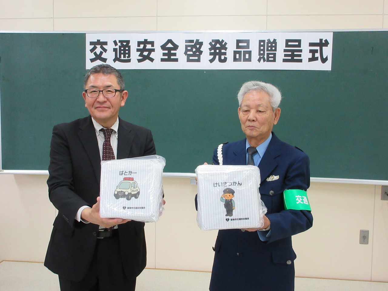 交通安全啓発品贈呈式が行われました。 堀口組様より交通安全協会の会員数の増加につながるようにと交通安全啓発品のハンドタオルを贈呈していただきました。 とてもかわいい「ぱとかー」と「けいさつかん」のハンドタオルです。 今後、交通安全協会の窓口にて協会に加入していただいた方に、お渡ししたいと思っております。