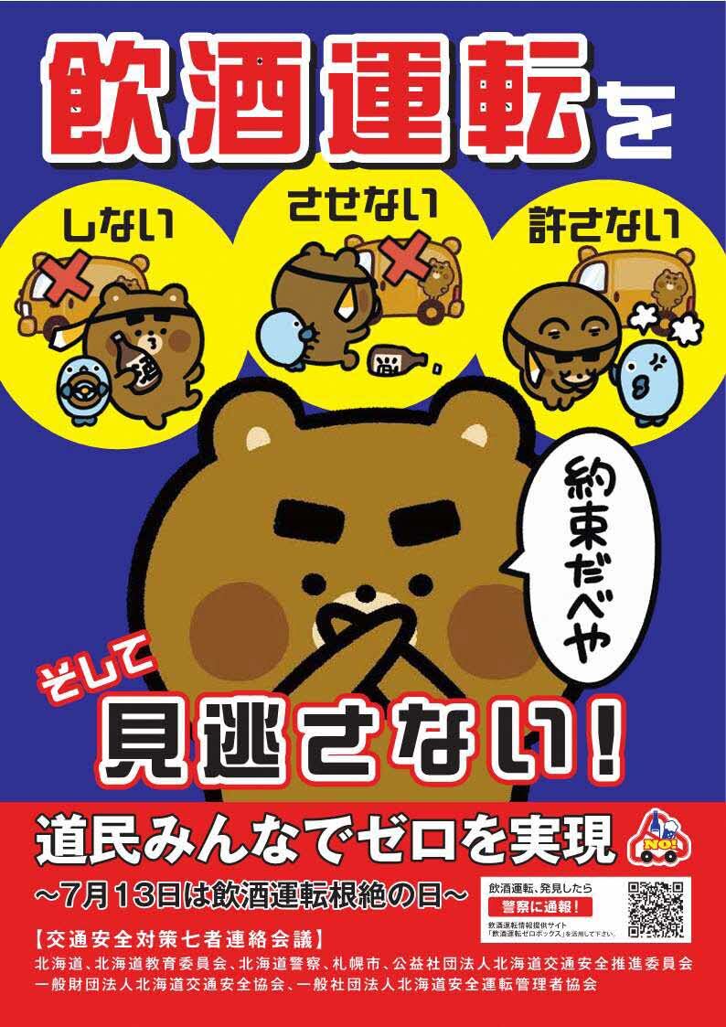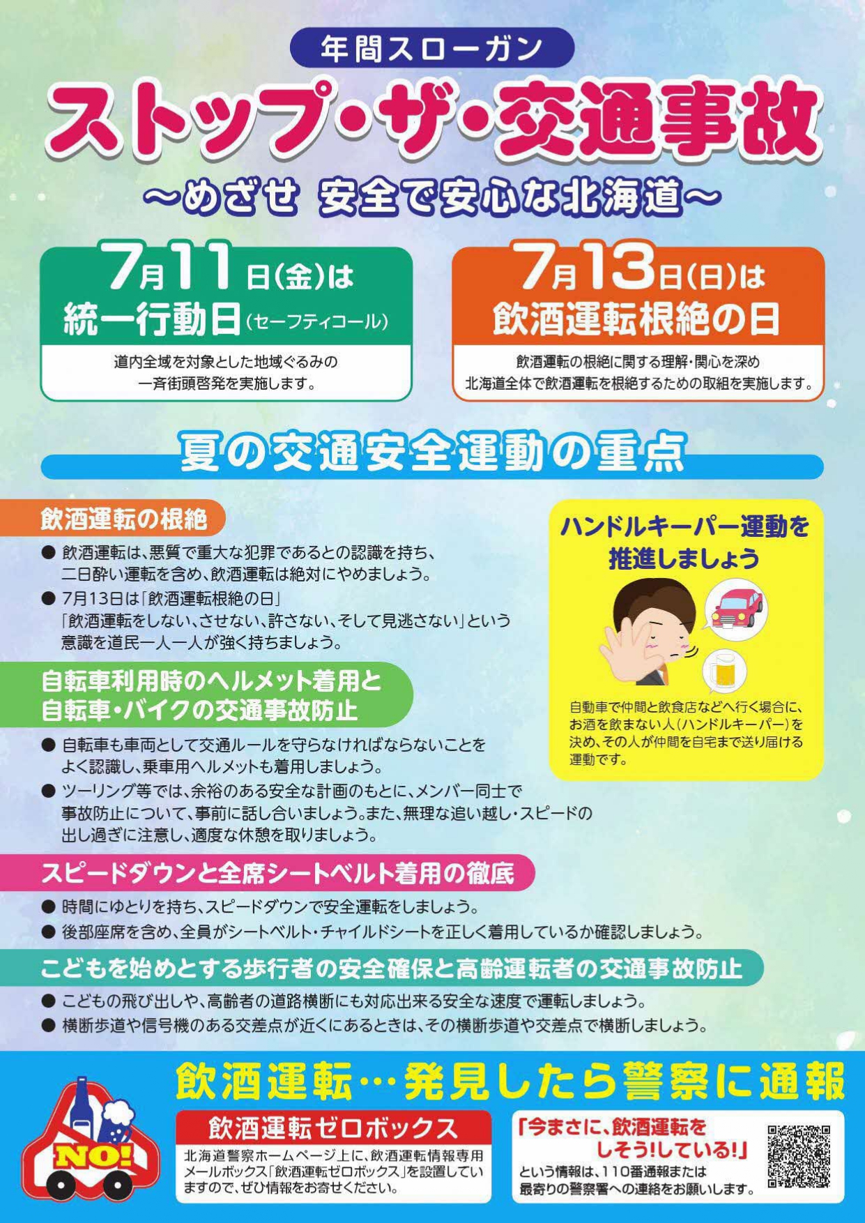 夏の交通安全運動が始まりました。(7月13日~22日) ●7月13日は「飲酒運転根絶の日」です。 「飲酒運転をしない、させない、許さない、そして見逃さない」という意識を道民一人一人が強く持ちましょう。 ●自転車も車両として交通ルールを守らなければならないことをよく認識し、乗車用ヘルメットも着用しましょう。 ●時間に余裕を持ち、スピードダウンで安全運転を。また、後部座席も含め、全員がシートベルト、チャイルドシートを着用しましょう。 期別交通安全運動報告